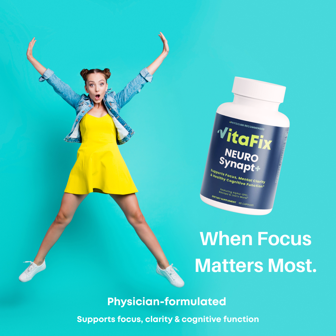Unlock next-level focus and mental clarity with VitaFix NEURO-Synapt+—a physician-formulated blend of key vitamins, minerals, amino acids, and brain-boosting botanicals. This powerful nootropic formula is crafted to support memory, learning, neuroactivity, and mental stamina—without the crash of stimulants.